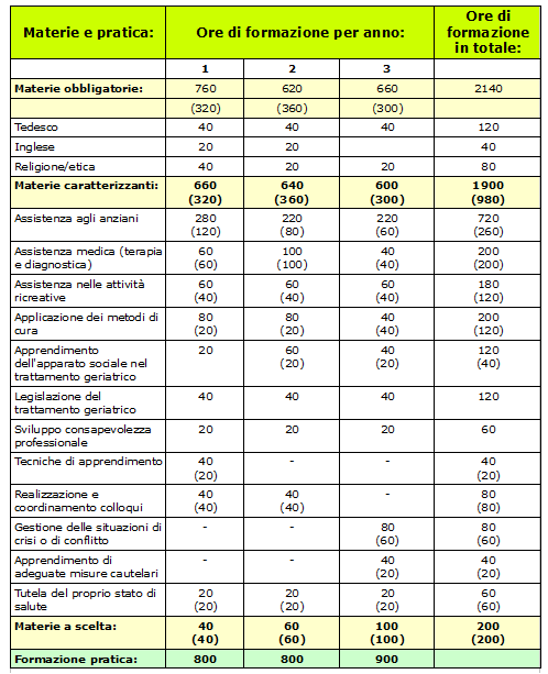 • la parte teorica si svolge in una scuola di formazione professionale e dura complessivamente 2340 ore di lezione. La parte pratica si svolge in un ente assistenziale e ha una durata di 2500 ore lavorative;