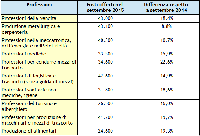 Le professioni metalmeccaniche, quelle della logistica e del trasporto sono aumentate tra l’8% e il 22%. Tutte queste professioni beneficiano del buon andamento delle esportazioni che richiede non solo più personale in produzione, ma anche nella spedizione delle merce.